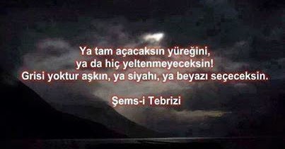 Ya tam açacaksın yüreğini ya da hiç yeltenmeyeceksin. Grisi yoktur aşkın ya siyahı ya beyazı seçeceksin şems i tebrizi. Ben güzel ruhuna aşık.